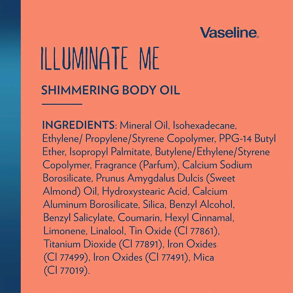 - Vaseline Shimmering Glow Body Oil provides a light shimmer that illuminates skin day or night.