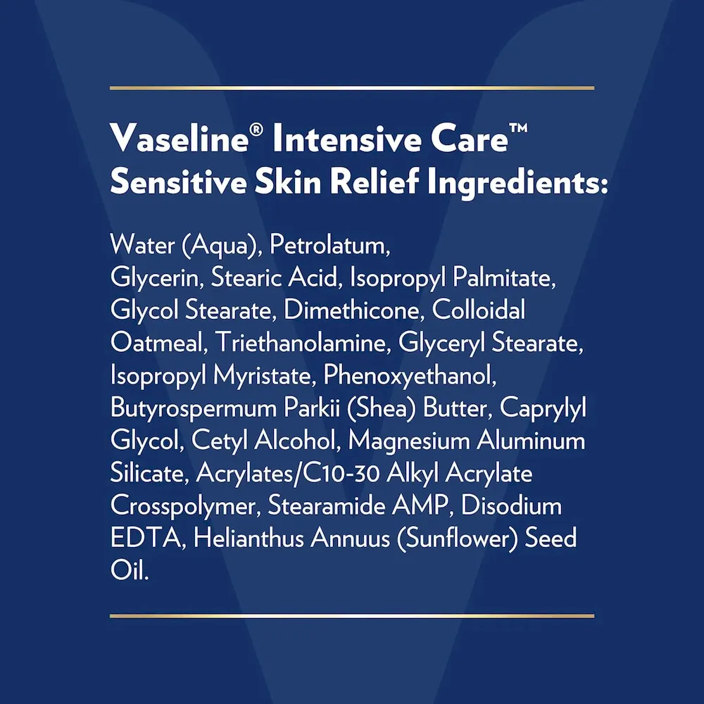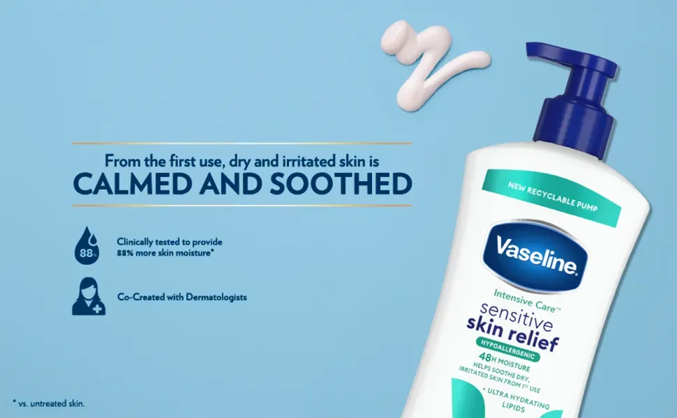 - FEEL THE SOOTHING RELIEF: Vaseline Intensive Care Sensitive Skin Relief Body Lotion was co-created with dermatologists to help soothe sensitive. dry. and irritated skin from first use