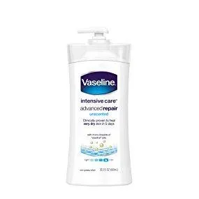 Vaseline Intensive Care Advanced Repair Unscented Lotion delivers moisture to heal very dry skin in just five days. This rich yet fast-absorbing lotion helps relieve dry skin by combining the healing properties of Vaseline Jelly with the moisturizing power of glycerin. Ideal for those with dry. itchy skin. this non-greasy body lotion is also suitable for people with eczema or sensitive skin.