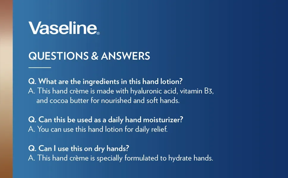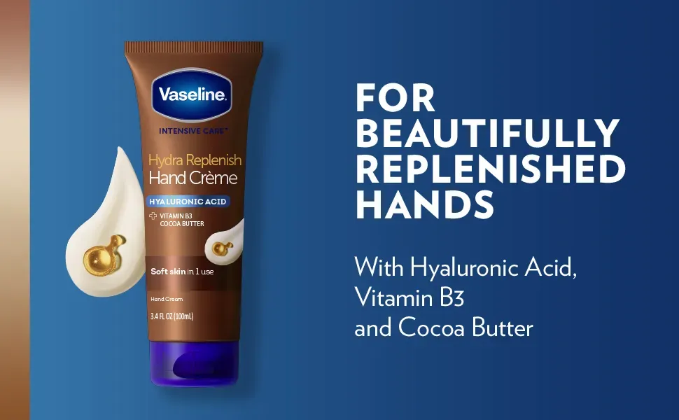 Vaseline Intensive Care Hydra Replenish Hand Cr??me is specially formulated for beautifully hydrated hands. This hand lotion is made with hyaluronic acid. Vitamin B3. and cocoa butter for soft skin in just 1 use.