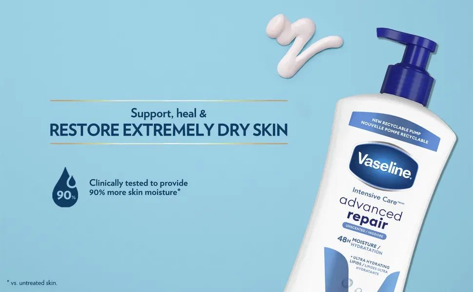 - REPAIRS EXTREMELY DRY SKIN: Vaseline Intensive Care Advanced Repair Unscented Body Lotion locks in moisture and repairs extremely dry skin