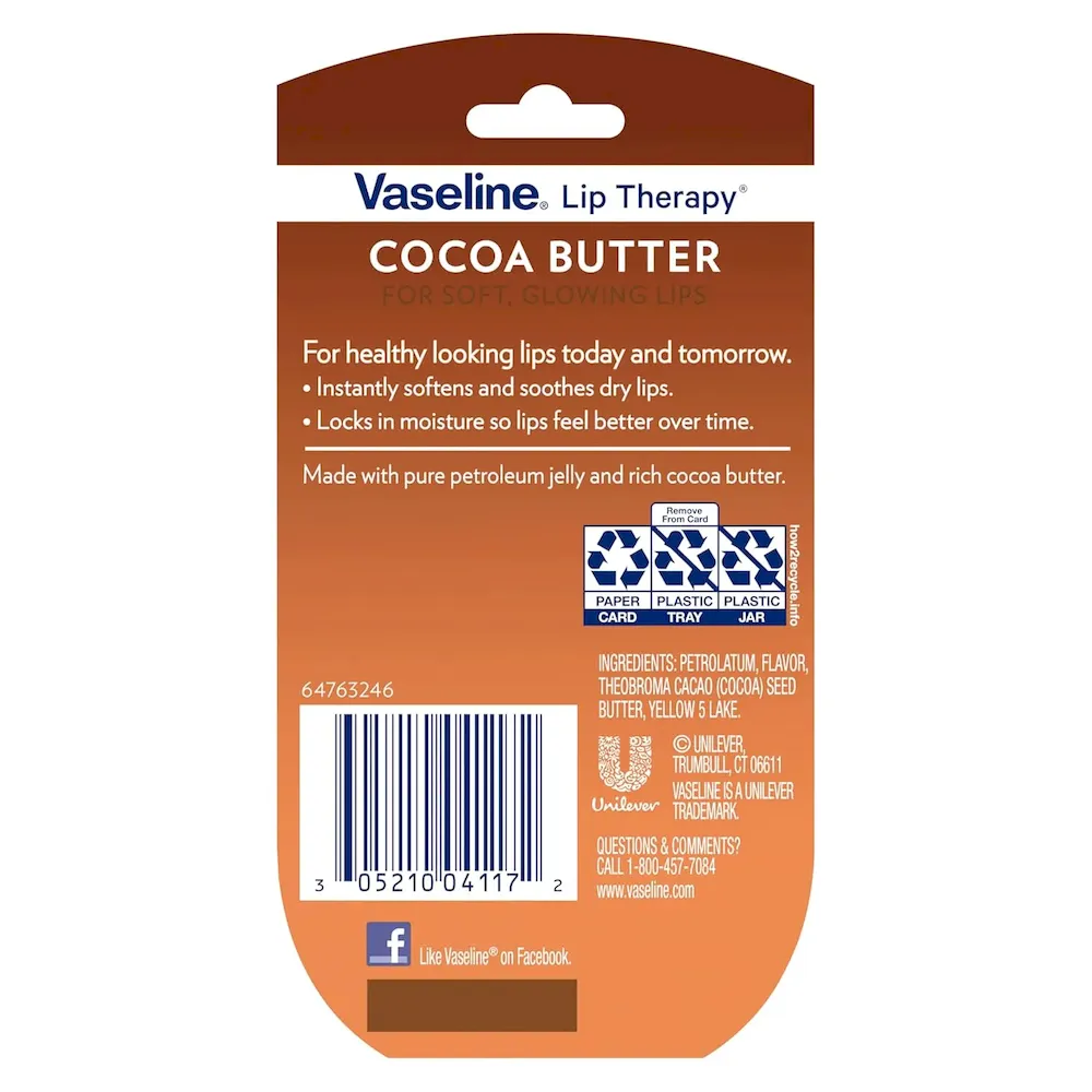Vaseline Lip Therapy Lip Balm Mini Cocoa Butter is clinically proven to help heal dry lips. The non-sticky formulas of Vaseline lip balm minis are invitingly soft and melt onto lips. The Vaseline Lip Therapy Cocoa Butter Mini comes in iconic packaging that fits neatly in your pocket or purse. so you can hydrate on-the-go. Vaseline for Lips Made with the Original Wonder Jelly. With its original formula. Vaseline Lip Therapy is a lip balm you can rely on that provides long-lasting relief from dryness. This everyday essential for healthy-looking lips is made with pure Vaseline Jelly. just like all Vaseline lip care products. Vaseline Jelly is the original wonder jelly that has been helping to heal dry skin since 1870. and now you can get all its benefits in a lip balm product exclusively designed for lips. The top. protective layer of skin on your lips is thinner than on the rest of your body. so it needs a lip balm that provides long lasting moisturization. These formulas help support the natural recovery of your dry lips by locking in moisture. Perfect for On-The-Go. The elements can be hard on your lips. so it’s essential to keep them moisturized. Vaseline Lip Therapy Lip Balm Mini Cocoa Butter is great for safeguarding against dryness caused by weather. so you can be confident that your lips are ready to face the outdoors.