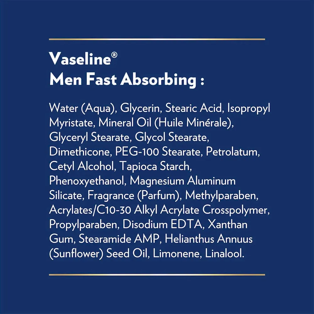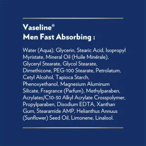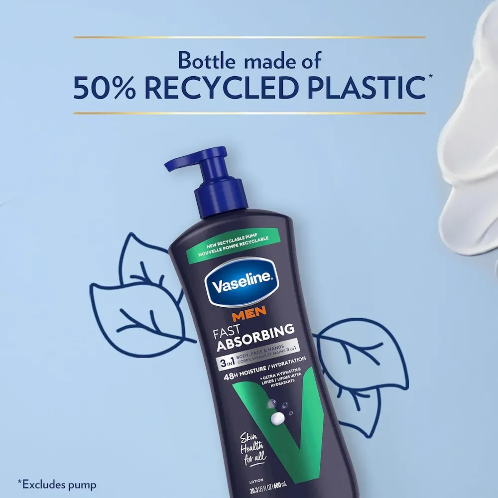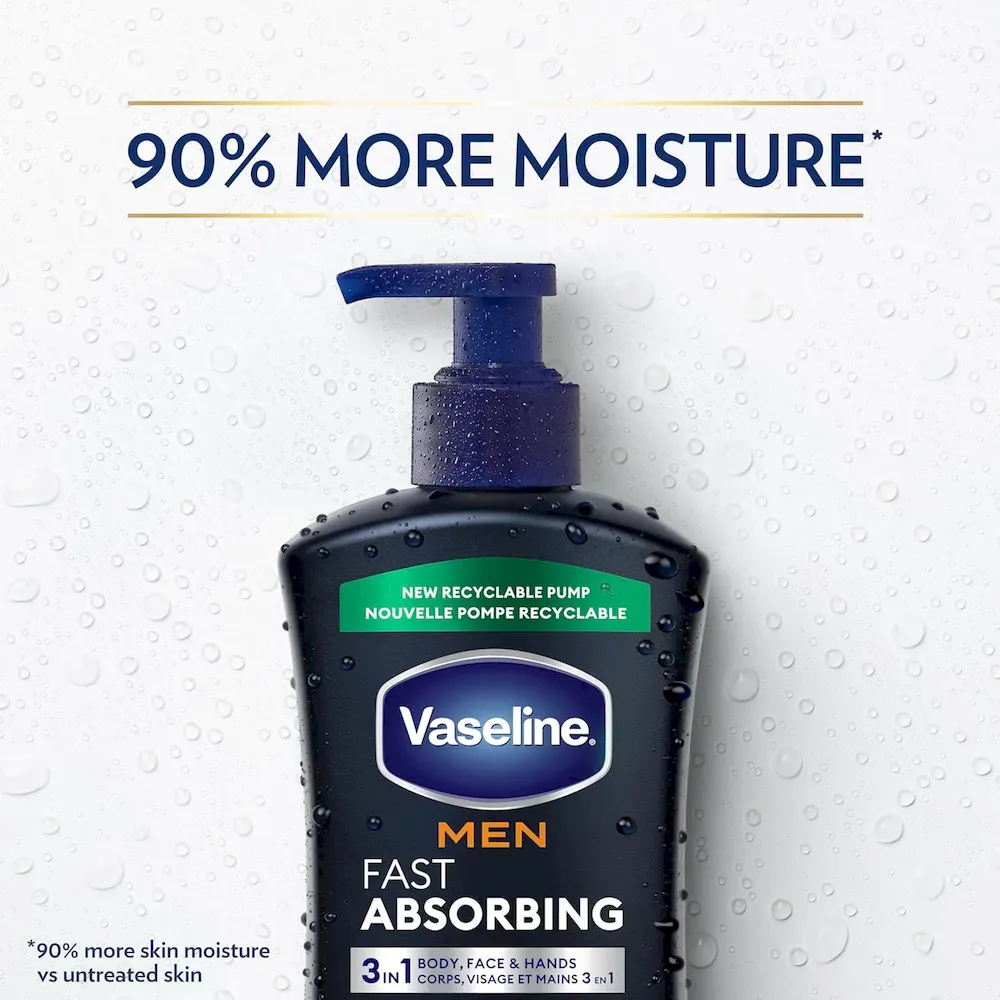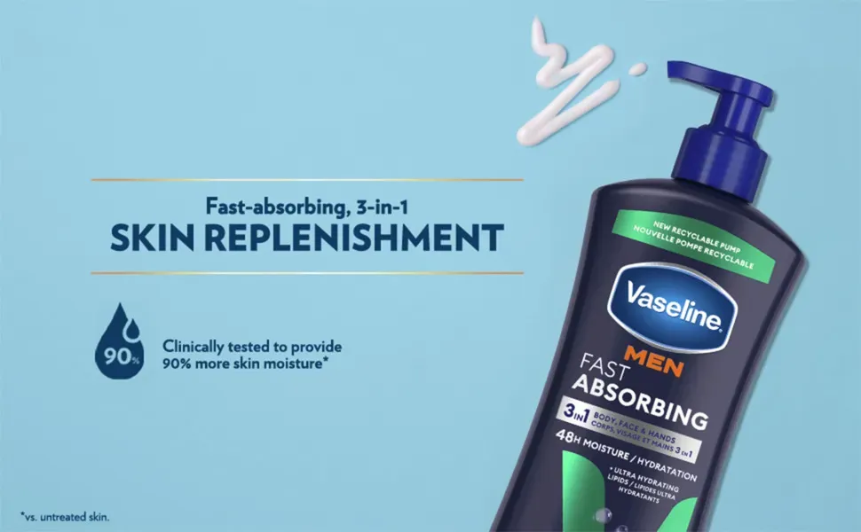 Vaseline Men Fast Absorbing 3-in-1 Face. Hands & Body Lotion for dry skin prevents dryness and helps keep your skin looking healthy and hydrated. This versatile moisturizer with Ultra-Hydrating Lipids is clinically tested to provide 90% more skin moisture compared to untreated skin. Leave your skin feeling soft and moisturized with Vaseline Men.