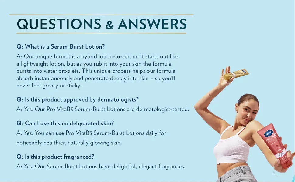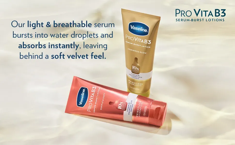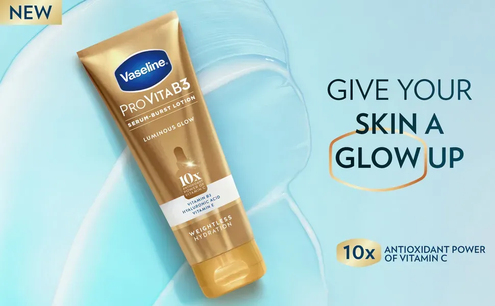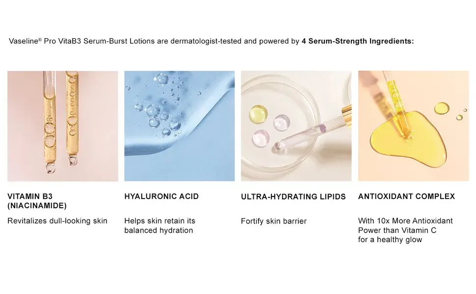 - Vaseline Pro VitaB3 Serum Burst Lotion. with10x the antioxidant power of Vitamin C from from our Antioxidant Complex. helps revitalize dull-looking skin for a healthy glow.