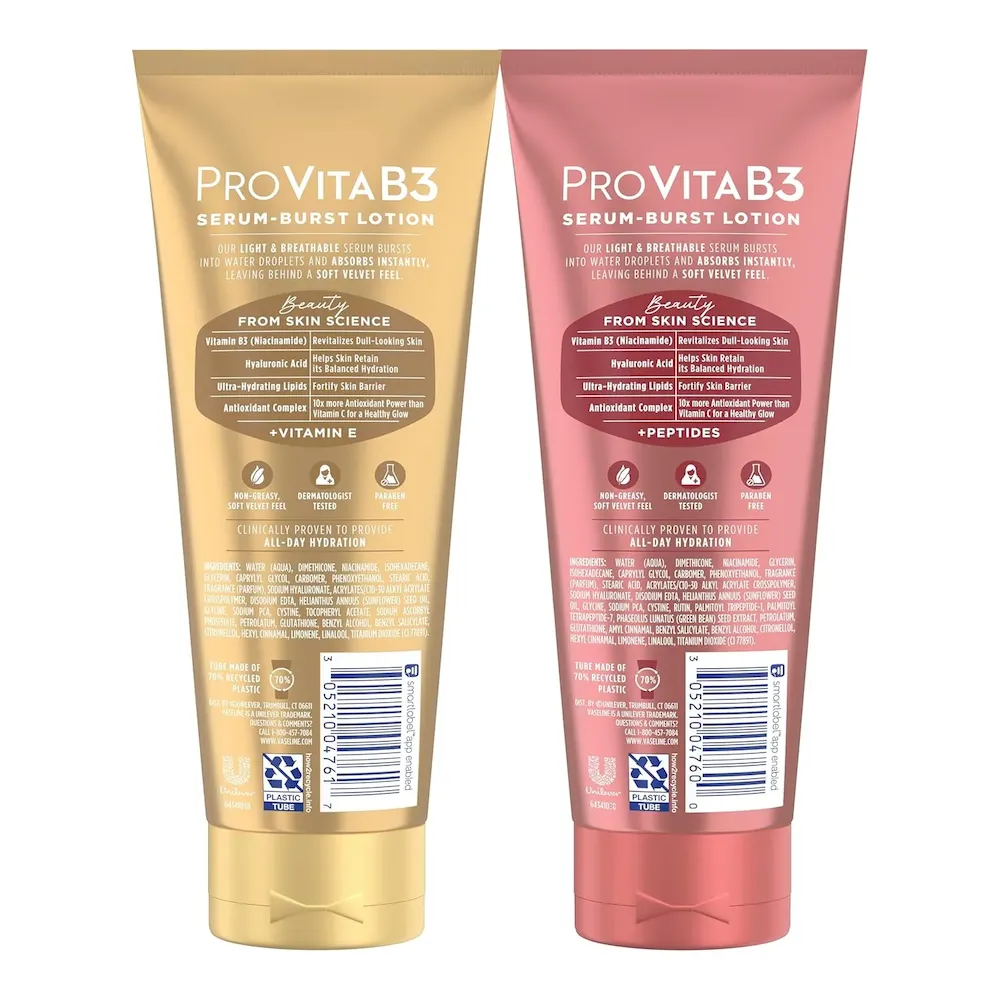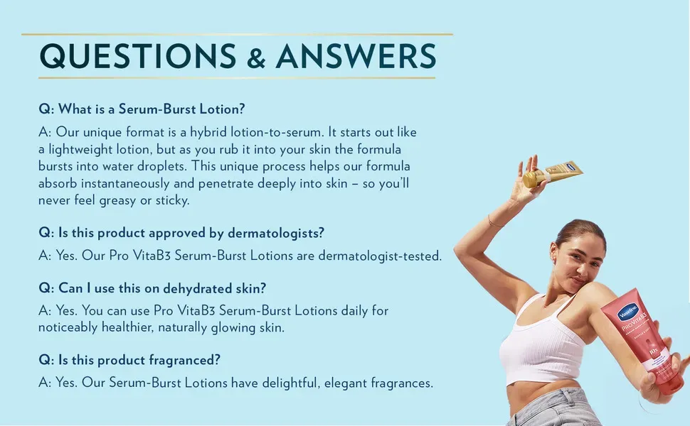 Vaseline Pro VitaB3 Serum-Burst Lotions are dermatologist-tested and powered by 4 Serum-Strength Ingredients: