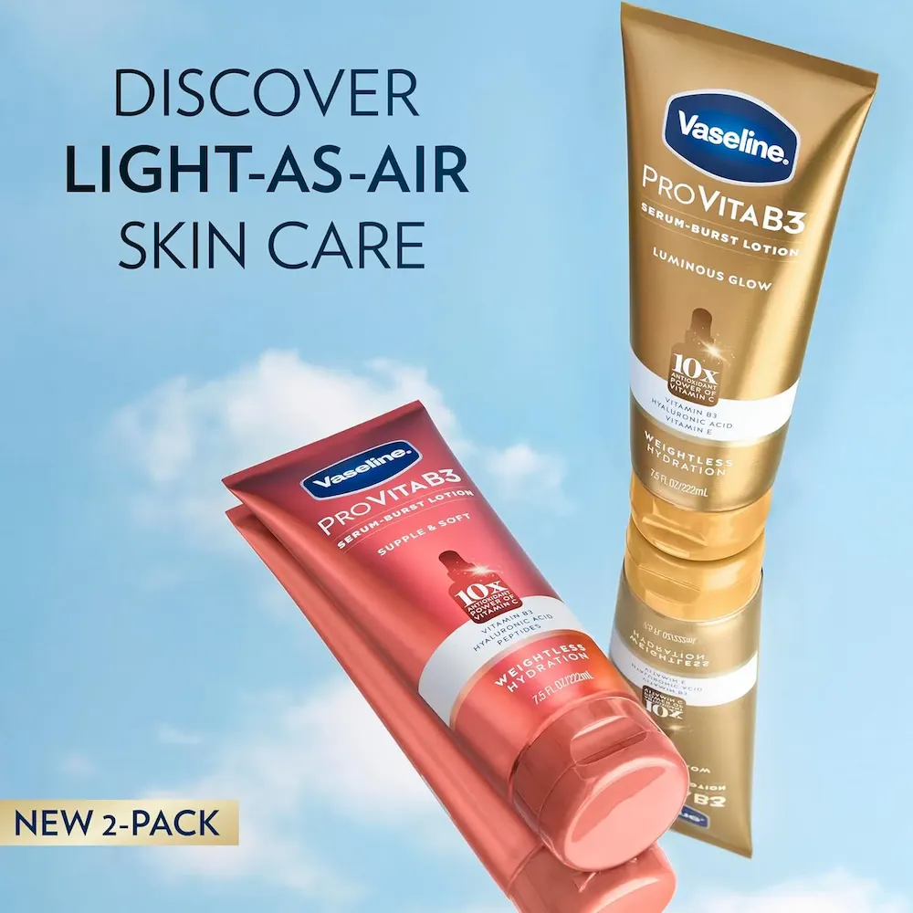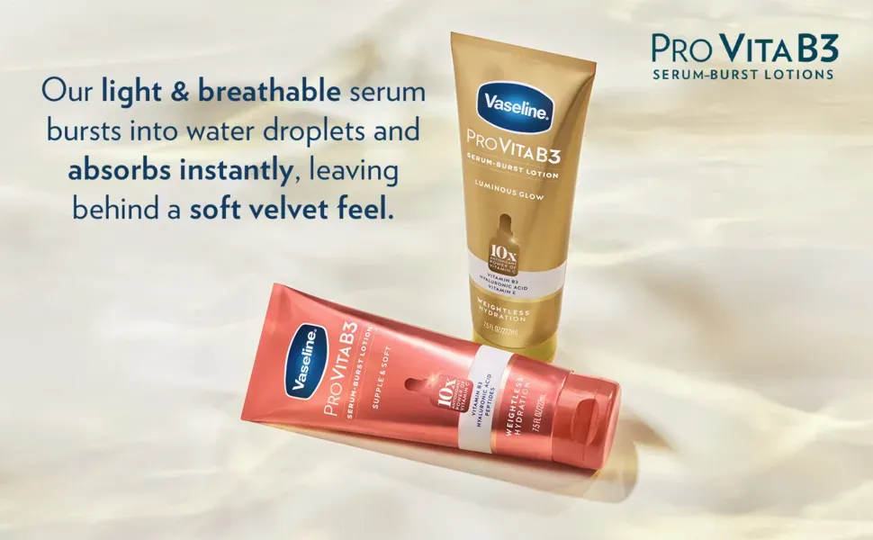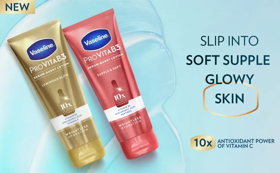 - Vaseline Pro VitaB3 Serum Burst Lotion. with 10x the antioxidant power of vitamin C from our Antioxidant Complex. helps revitalize dull-looking skin for a healthy glow.